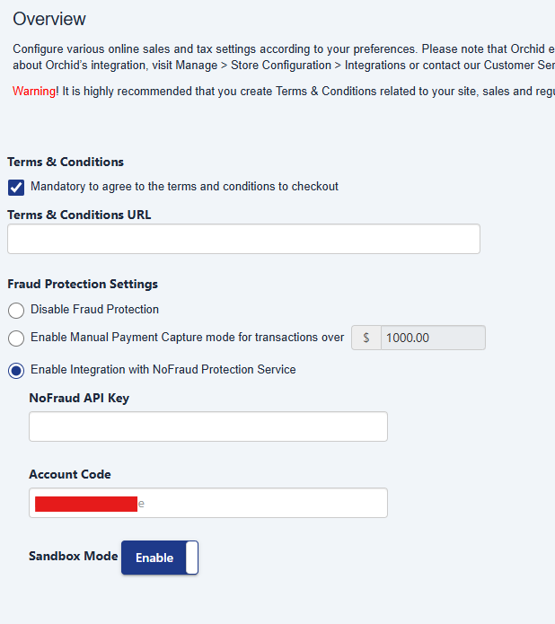 your Nofraud API Key and Account Code confidential. Store them securely and